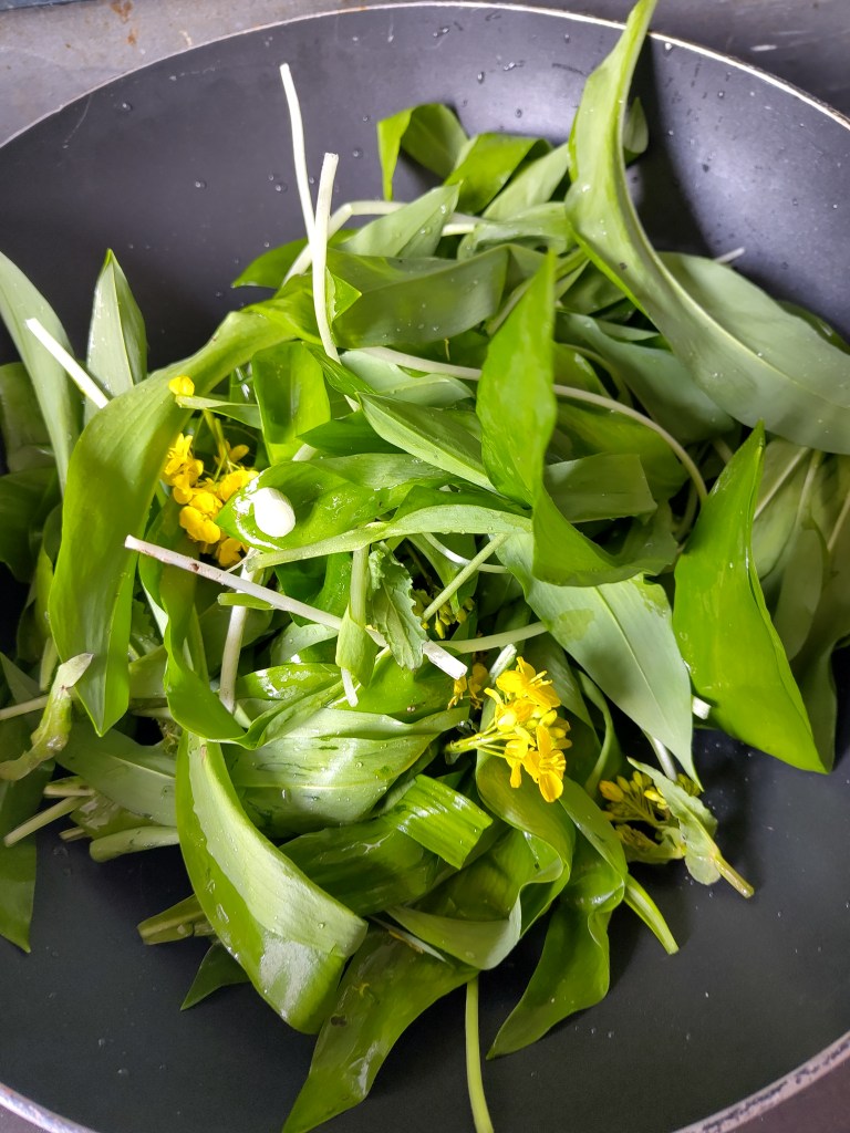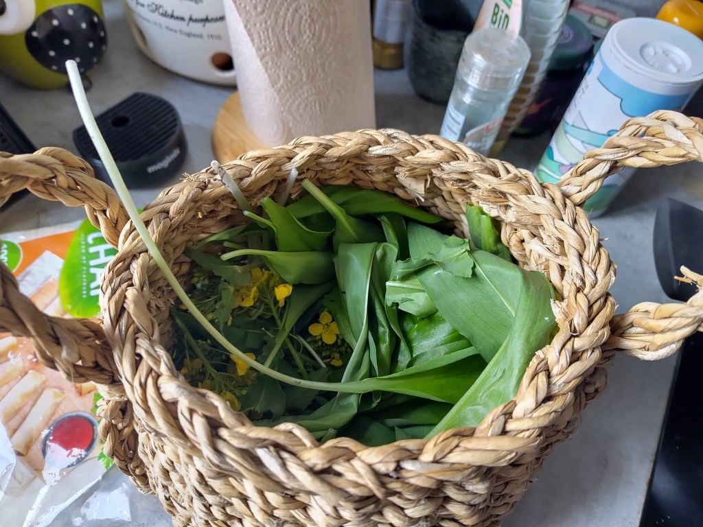 Vandaag was het plan om loempia’s te maken van daslook, raapzaad, rijstvermicelli en rijstvellen. Het regende en ik ging met mijn mand op pad naar een plaats waar de honden niet bij de daslook kunnen. De slakken wel, kwam ik thuis achter, er zaten veel babyslakjes in de daslook. In de regen raapzaadtoppen plukken leverde ook wat verbaasde blikken op van mensen die tegen hun zin in buiten waren. Afijn, daslook en raapzaad zonder slakjes en vuil in de wok, het hele huis geurde heerlijk. Toen kwam ik er achter dat mijn rijstvellen onbruikbaar waren en hebben we genoten van een heerlijke wok van daslook en raapzaad. Die loempia’s komen een andere keer wel.