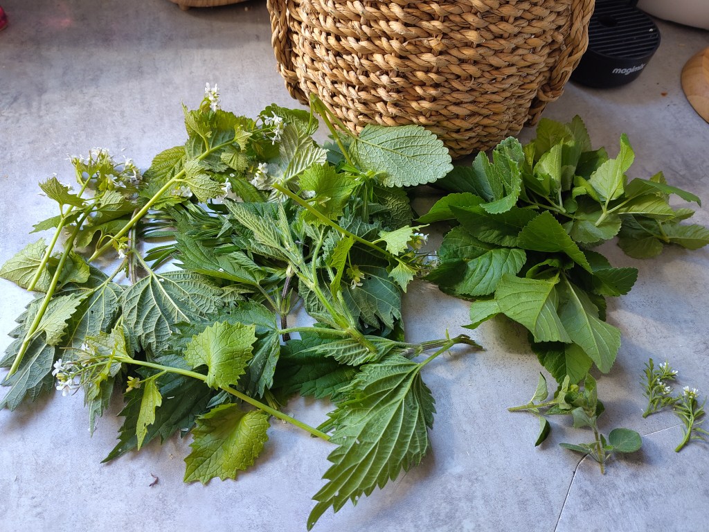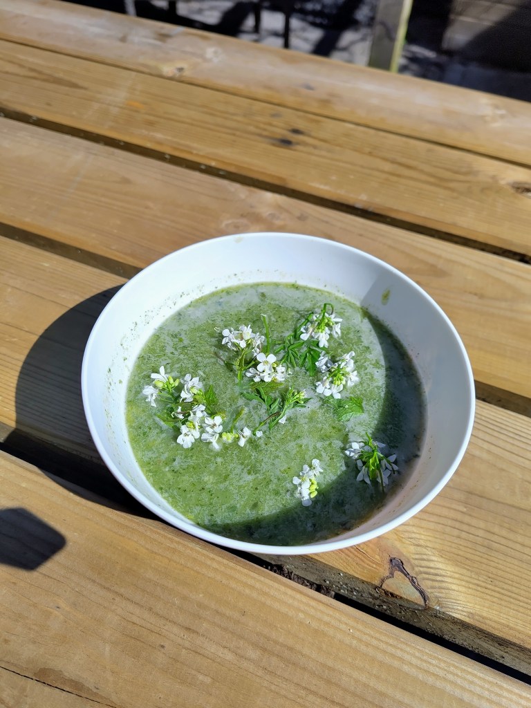Mijn wildpluk voor deze soep was: brandnetel, jonge toppen! Zevenblad, look zonder look. Uit eigen tuin: ook zevenblad, oregano en voor de decoratie veldkersbloemetjes. Anders gaan ze toch de groenbak in, want de veldkers groeit anders over mijn jonge radijzen.