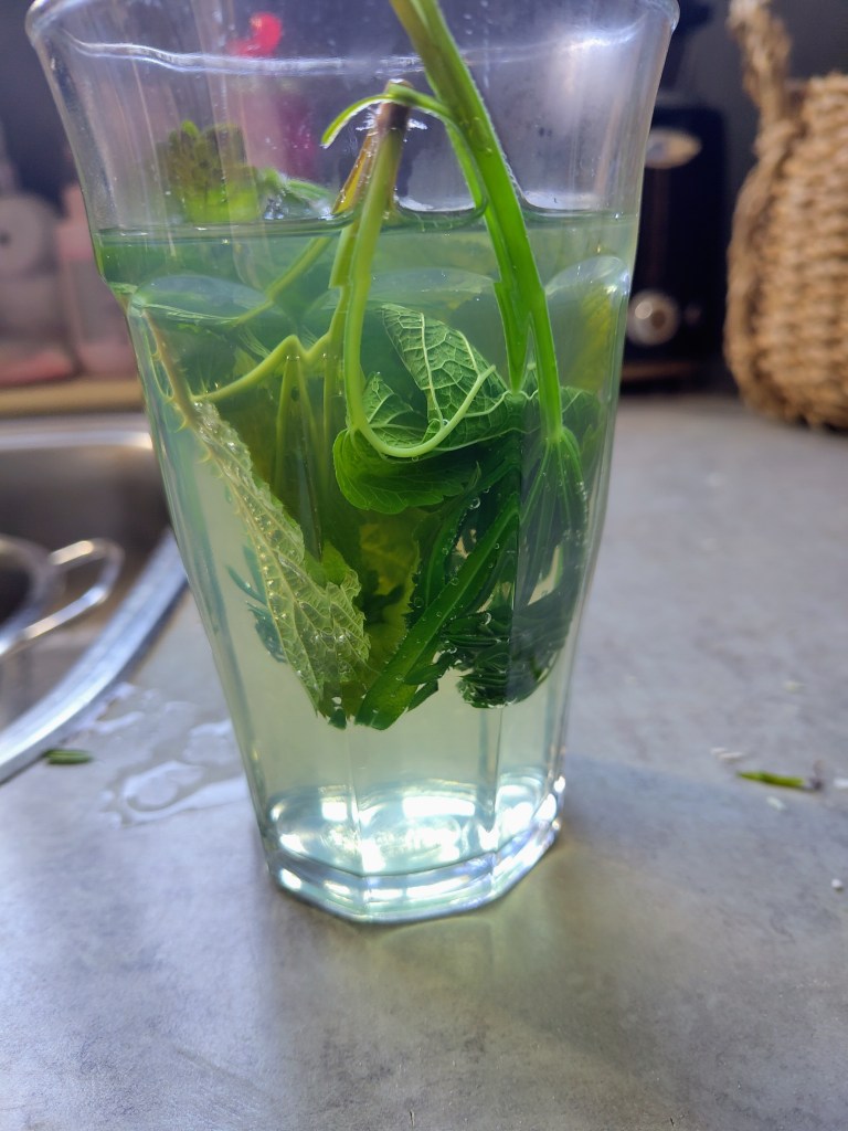 Deze thee bevat door het braamblad en kleefkruid veel mineralen, de citroenmelisse maakt hem extra lekker. Daar heb je dus geen recept voor nodig, doe me gewoon na. Wel jong braamblad plukken. Vandaag heb ik er een beetje stevia ingedaan, want ik ben mijn agavesiroop kwijt. Leve de chaos. Gelukkig is citroenmelisse rustgevend.